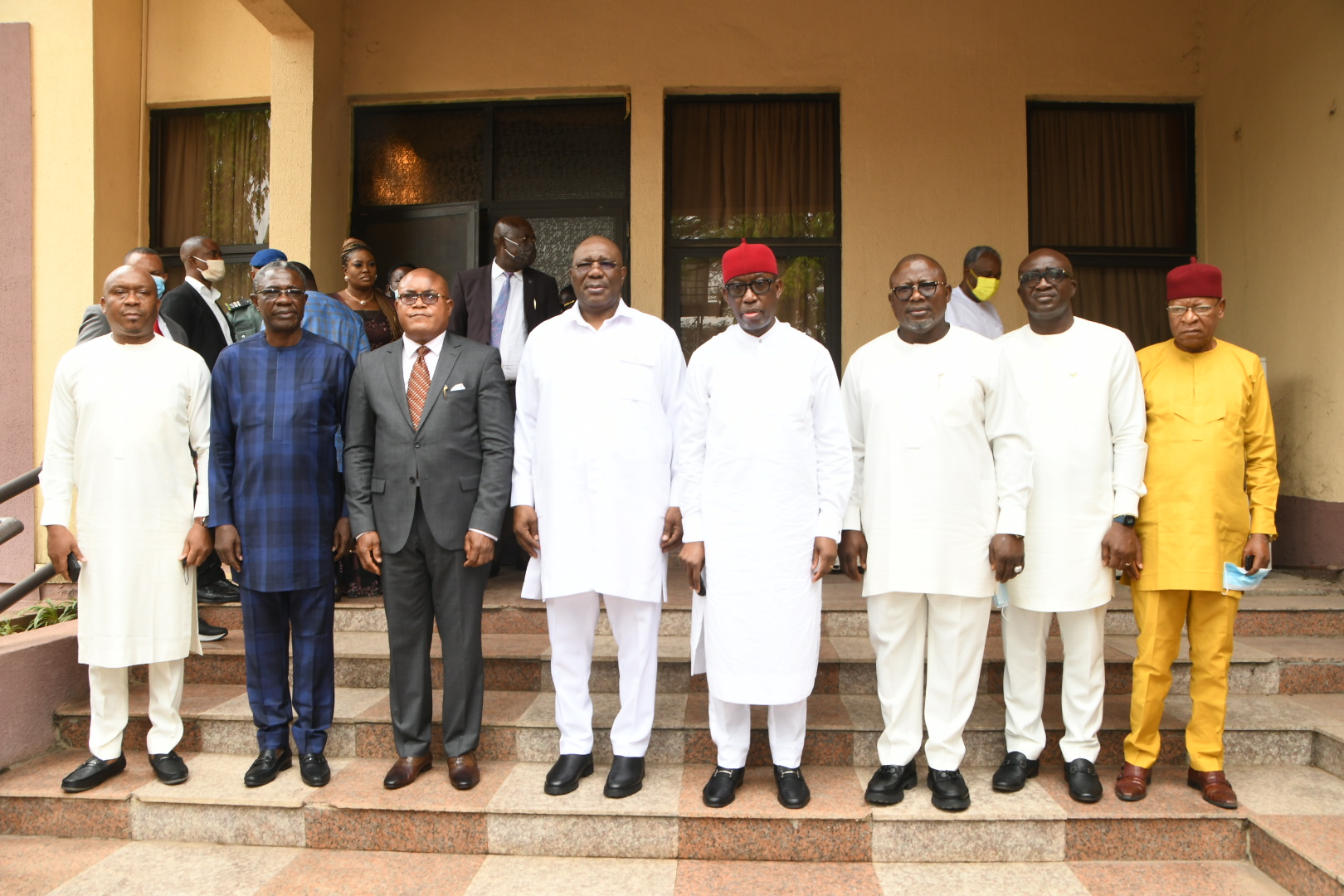 Delta Governor, Senator Dr. Ifeanyi Okowa (4th right), his Deputy, Deacon Kingsley Otuaro (4th left), Speaker, Delta State House of Assembly, Rt .Hon .Sheriff Oborevwori (3rd right), Secretary to the Government, chief Patrick Ukah (2nd right), and the newly sworn-in Senior Political Adviser to the Governor, Rt. Hon Funkekeme Solomon (3rd left), and 3 Special Advisers: Mr. Austin Ayemidejor (2nd left), Mr. Darlington Ijeh, (left), and Chief Emmanuel Onyeuku (right), shortly after they subscribed to the Oath of office in Government House, Asaba on Monday.