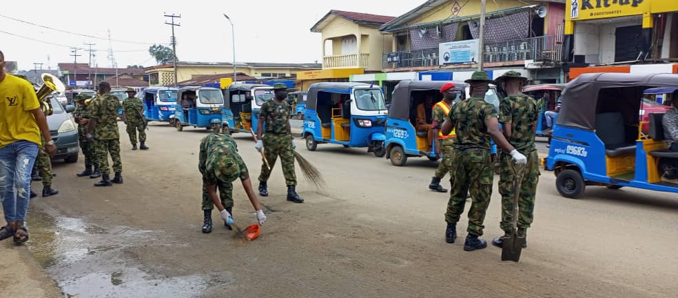 As early as seven am, the military men moved swiftly as they cleared the roads and pavement along the Ogbeogonogo market. They came with shovels, brooms, rakes, wheelbarrows and a truck to offload wastes, including traffic officers to ease movement and a military band to stimulate the proceedings.