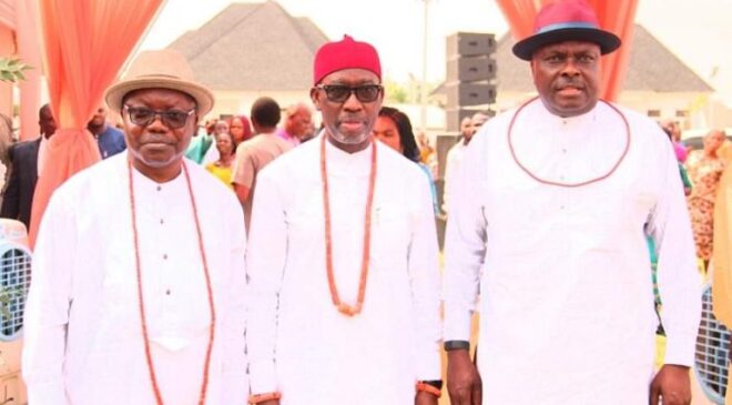Former Gov Uduaghan (Left), Gov Ifeanyi Okowa (Centre) and Former Governor James Onanefe Ibori (Right)