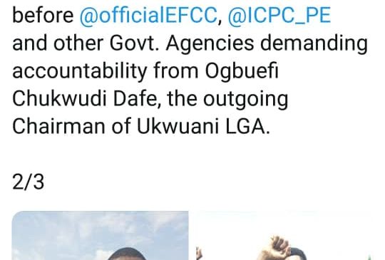 In several tweets in his verified twitter handle@mrdueprocess, on October 22, 2020, he stated that by Monday 26, October 2020, he will file a petition before the Economic and Financial Crime Commission, EFCC, and the Independent Corruption Practices Commission, ICPC, and other government agencies demanding for accountability from the outgoing council chairman, Ogbuefi Chukwudi Dafe.