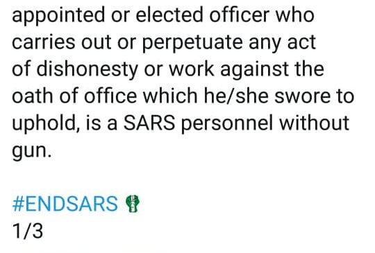 Mr. Chukwuemeke further twitted that anybody in leadership and authourity, whether as a civil servant, appointed or elected officer who carries out or perpetuate any act of dishonesty or work against the oath of office which he or she swore to uphold, is a SARS personnel without gun.