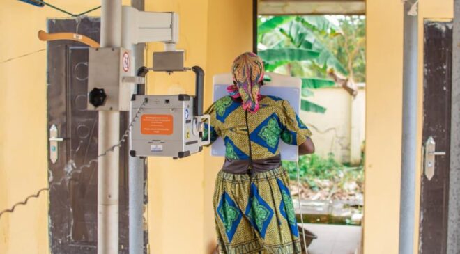 A patient undergoing chest x-ray during the programme