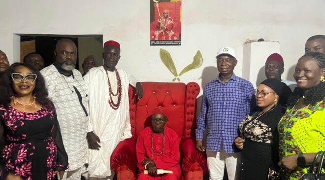 ISSELE-MKPITIME/Nigeria: The Obi of Issele-Mkpitime Kingdom in Aniocha North Local Government Area of Delta State, His Royal Majesty, Obi Sunday Ubaka Ogboli, has applauded Senator Ned Munir Nwoko for fulfilling his promise to revisit the community and push forward key development projects. The senator’s visit on Saturday, June 7, drew praise from the monarch and his traditional cabinet for what they described as “integrity in action.”