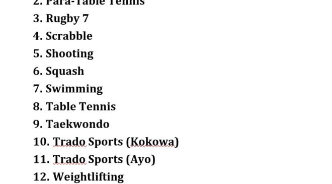 The final batch, from 3 p.m. to 5 p.m., will cover Para-Athletics, Para-Table Tennis, Rugby 7, Scrabble, Shooting, Squash, Swimming, Table Tennis, Taekwondo, Traditional Sports (Kokowa and Ayo), Weightlifting, and Wrestling.
