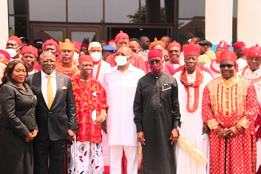 Delta Governor, Senator Dr. Ifeanyi Okowa (3rd right); Deputy Governor of Delta, Barr. Kingsley Otuaro (middle); the new Chairman, Delta State Traditional Rulers Council, His Royal Majesty, Major Gen. Felix Mujakperuo (Rtd) Orhue I, the Orodje of Okpe (2nd right); Immediate past Chairman of the Council, His Royal Majesty, Dr. Emmanuel Efezomor the II, Obi of Owa Kingdom and 1St Vice Chairman, His Royal Majesty, Pere Stanley Like Kalanama VIII, the Pere of Akugbene-mein (right); Speaker, Delta State house of Assembly, Rt. Hon. Sheriff Oborevwori (2nd left); President Customary Court of Appel, Hon. Justice, Patience Elumeze (left) and others Traditional rulers from various kingdoms across the State shortly after the Inauguration of the new Chairman and members of the reconstituted Delta State Traditional Rulers Council at the Council’s Secretariat in Asaba on Tuesday.