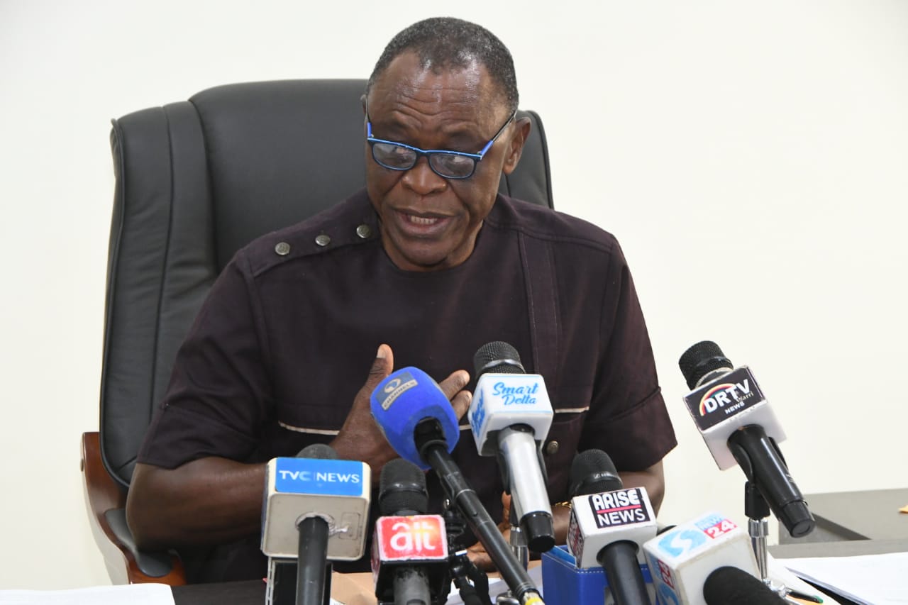 Delta State Commissioner Higher Education, Prof Patrick Muobuoghare, addressing Journalists on issues raised by ASUU’s national President against Delta State Government in Asaba on Monday.
